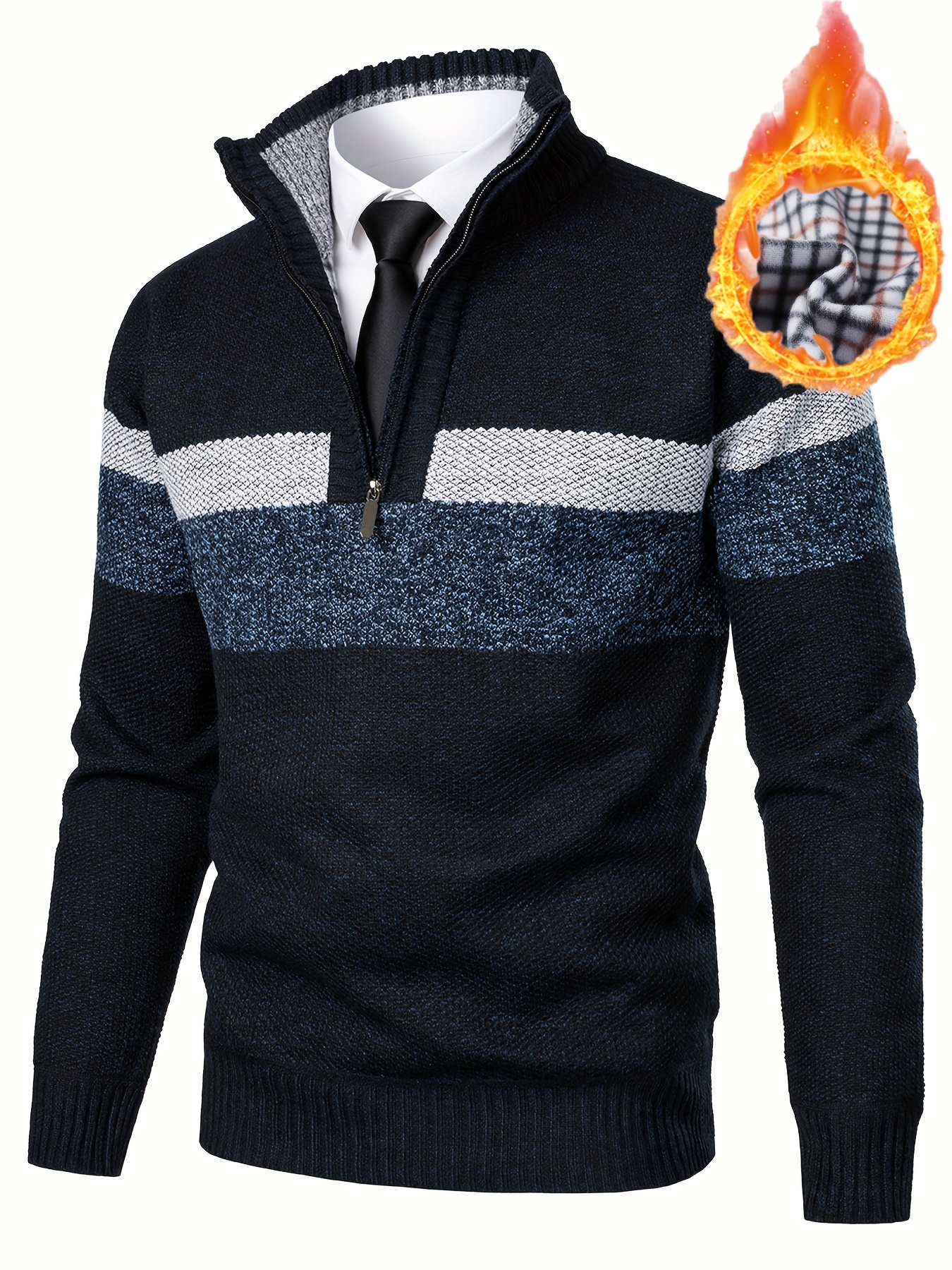 Plus Velvet Thickened Men's Color Block Stand Collar Knitted Pullover Sweater, Polyester Long Sleeve Regular Fit Casual Style for Fall/Winter.