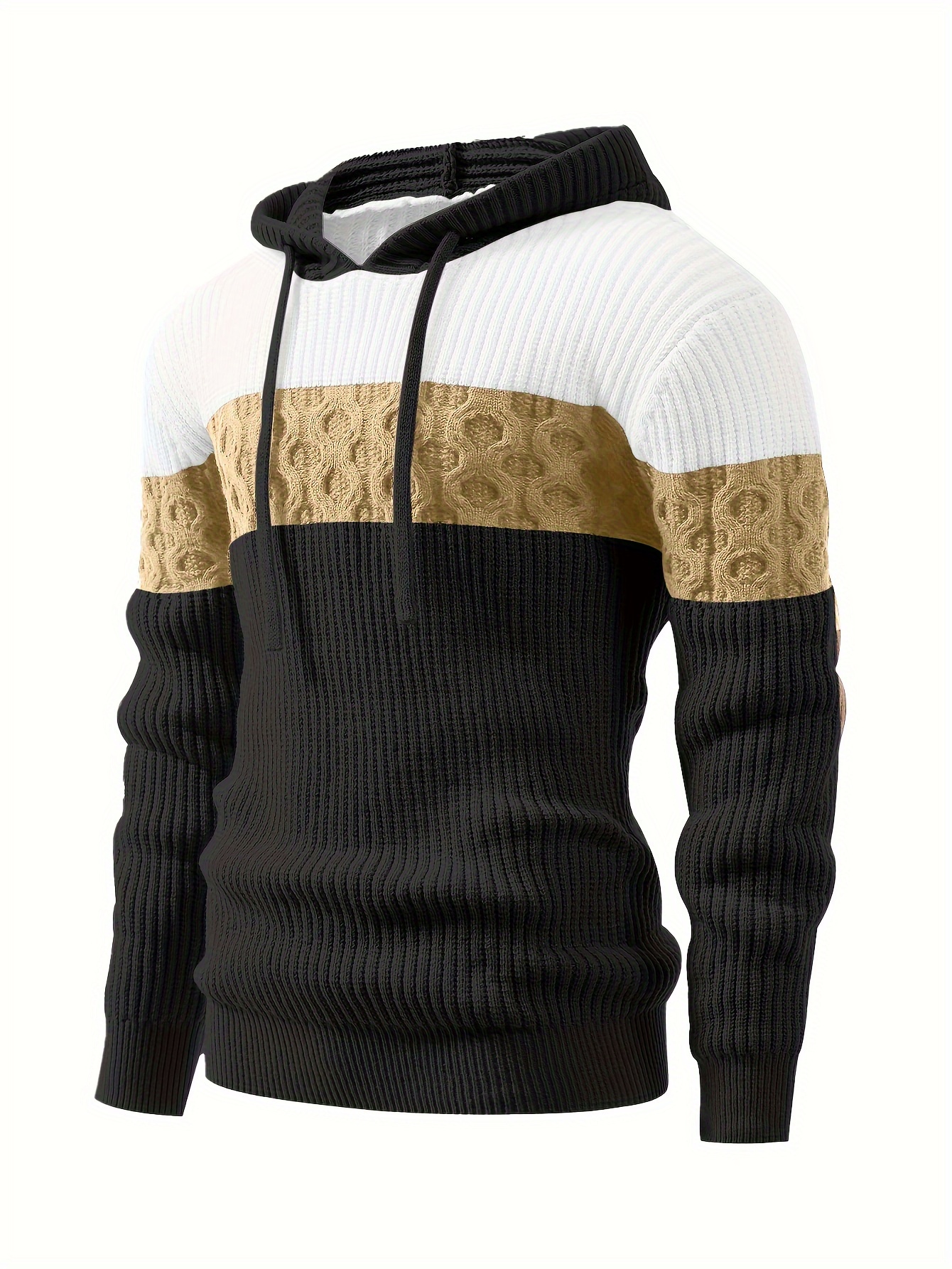 Soft Chunky Cable Knit Men's Hoodie Sweater - Color Block Design for Casual Wear - Polyester Blend...